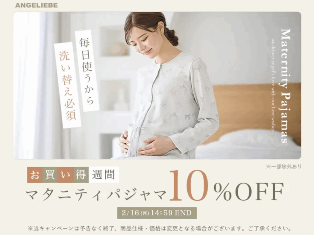 現在エンジェリーベでは、お買い得習慣マタニティパジャマ10%OFF実施中!
