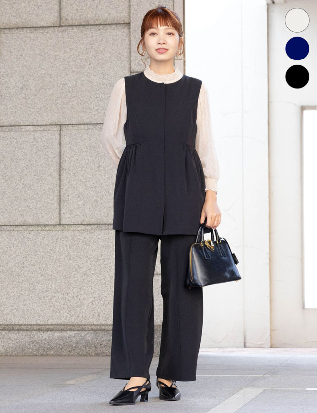 ・ペプラムジレとワイドパンツのセットアップ。パンツはセンタープレスがあるので、きちんと見え。