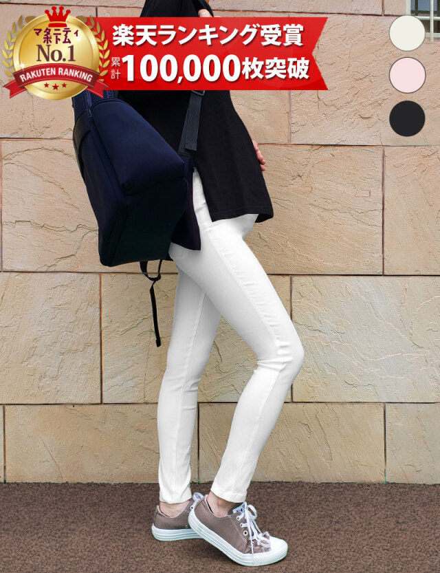 マタニティの間は上も下もゆったりだから、少しでもスッキリ見える方がいいという方には、スキニータイプもズボンもおすすめ。