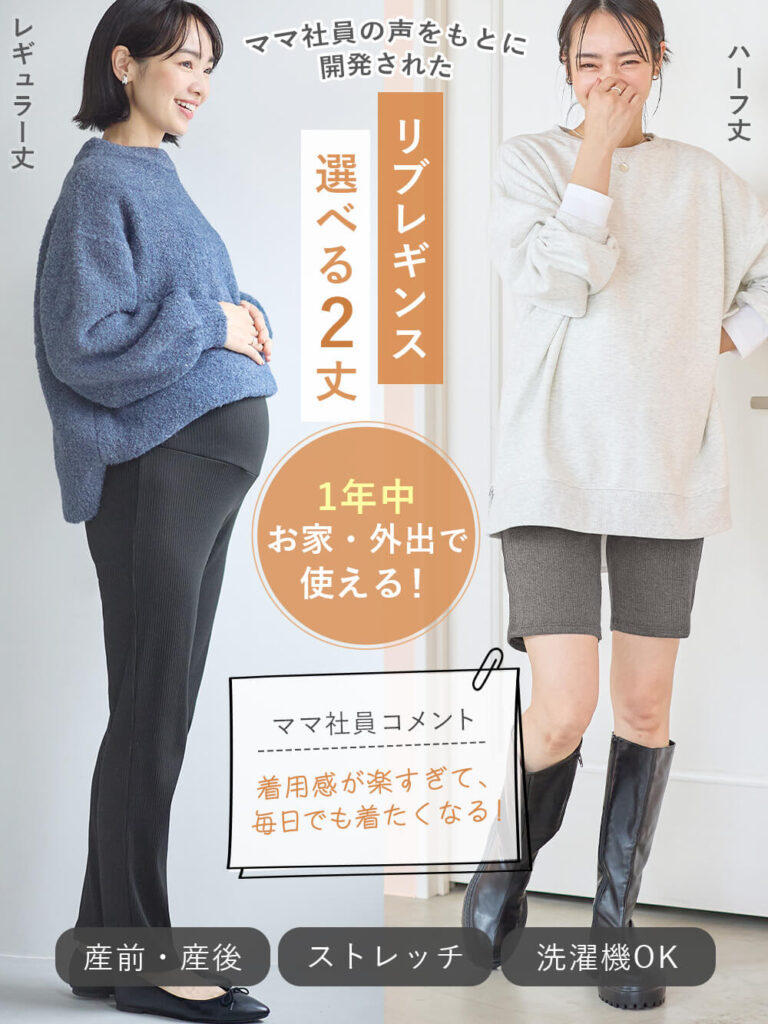 マタニティの間は上も下もゆったりだから、少しでもスッキリ見える方がいいという方には、スキニータイプもズボンもおすすめ。
